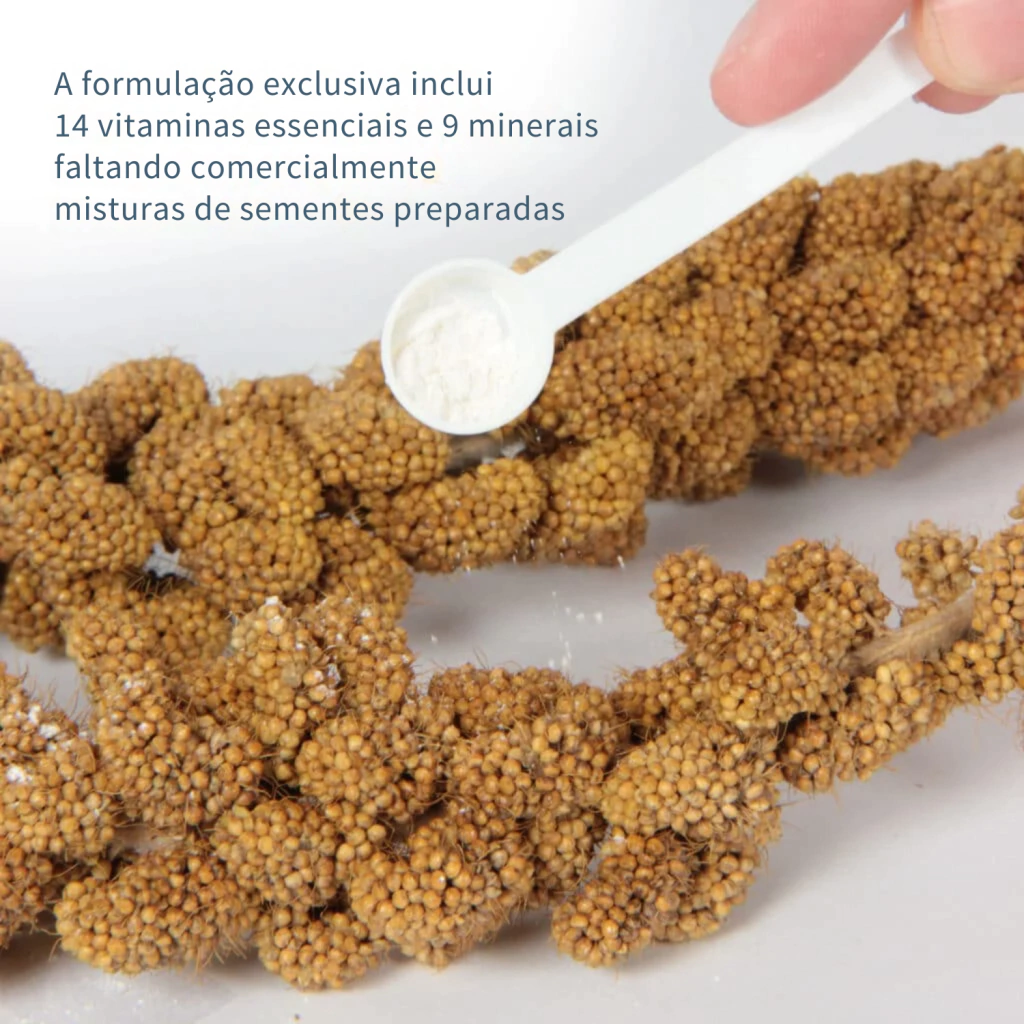 Contém 14 vitaminas essenciais e 9 minerais que faltam nas misturas de sementes. Além disso, fornece quantidades adequadas de dois aminoácidos essenciais - Lisina e Metionina - que não podem ser produzidos pelas aves, mas são vitais para seu crescimento e absorção proteica adequado.
